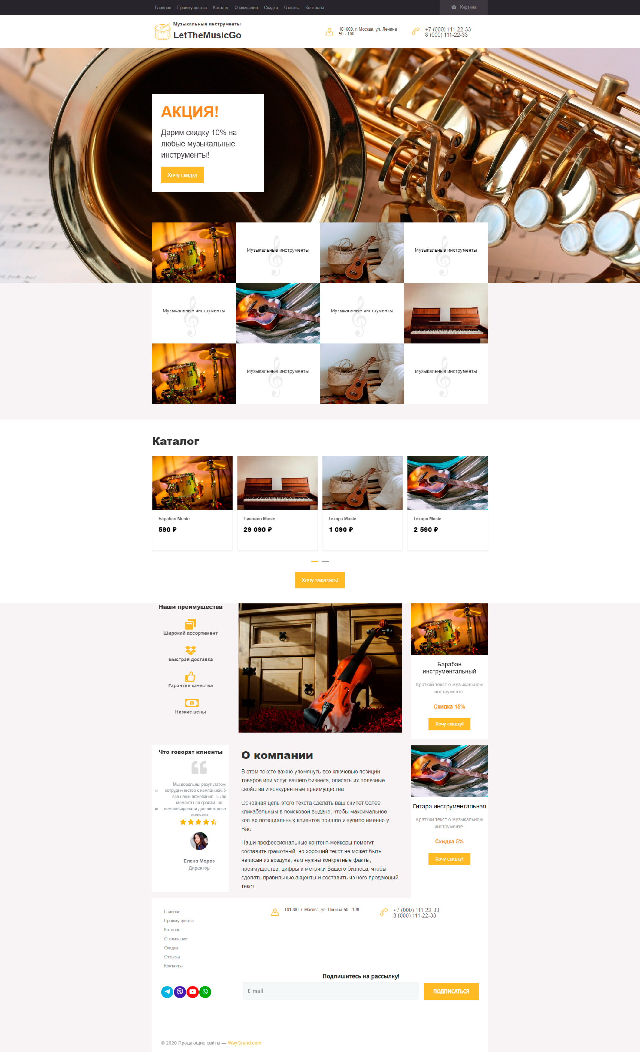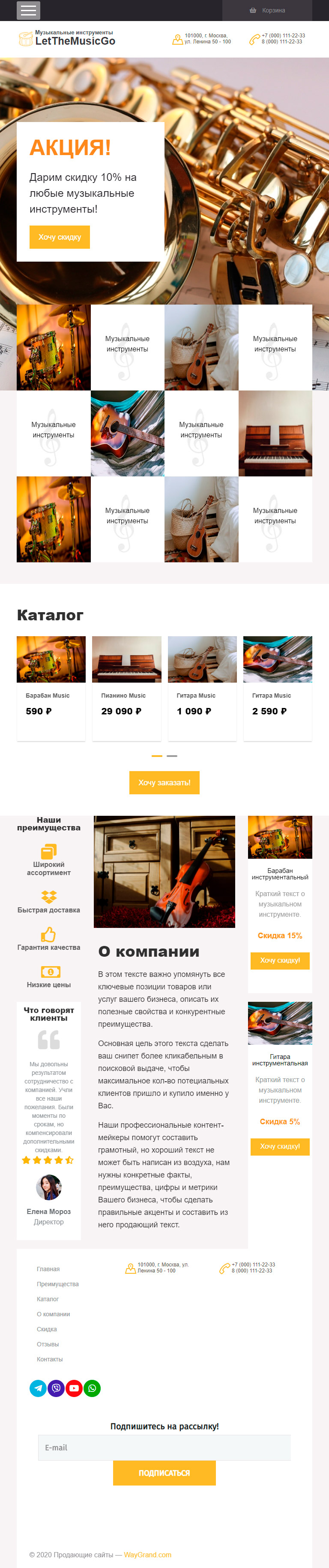 Закажите готовый продающий сайт лендинг #0710201 в Магадане за 1-3 дня «под ключ»: свёрстан, отрисован и готов к рекламе. Тематика шаблона «Музыкальные инструменты».