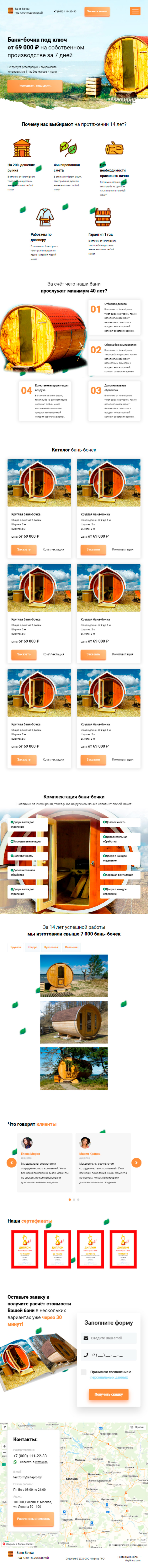 Закажите готовый продающий сайт лендинг #2172204 в Магадане за 1-3 дня «под ключ»: свёрстан, отрисован и готов к рекламе. Тематика шаблона «Баня-бочки».